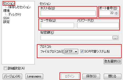 ユーザ認証画面にて、左側の『 セッション 』をクリックし、接続情報を入力します。