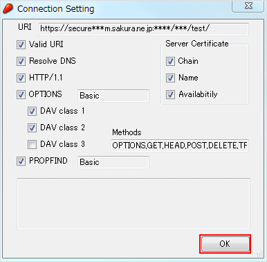 チェックボックスが全てチェック、エラーが表示されない場合は、 問題なく接続ができていますので『 OK 』をクリックします。
