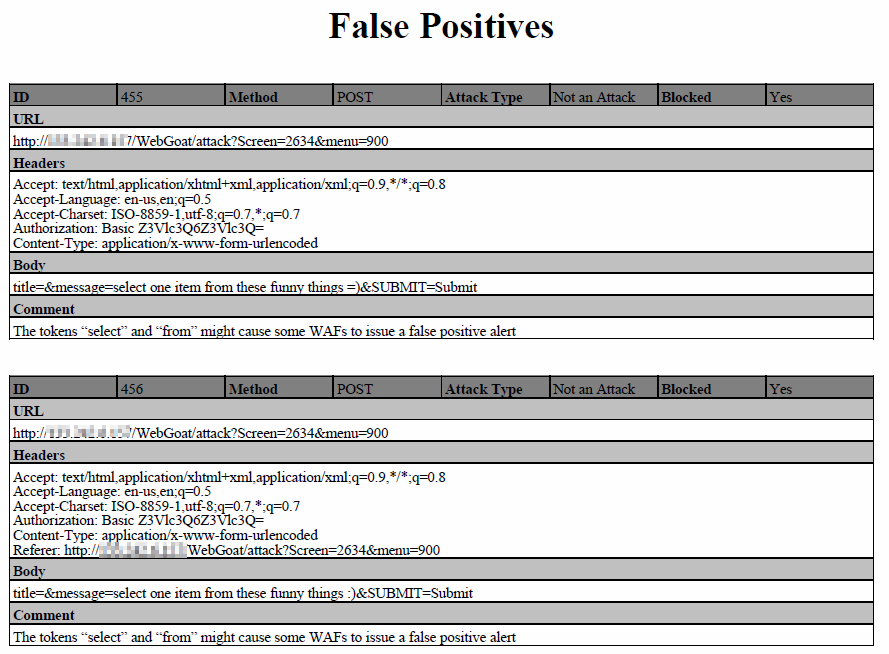 出力されたレポートでは、どういったリクエストがFalse Positivesとして認識されたかも記載されている。たとえば今回の例では、POSTリクエストのBody内に「select」や「from」という文字列が含まれているだけでブロックされていることなどが分かる(図9)。