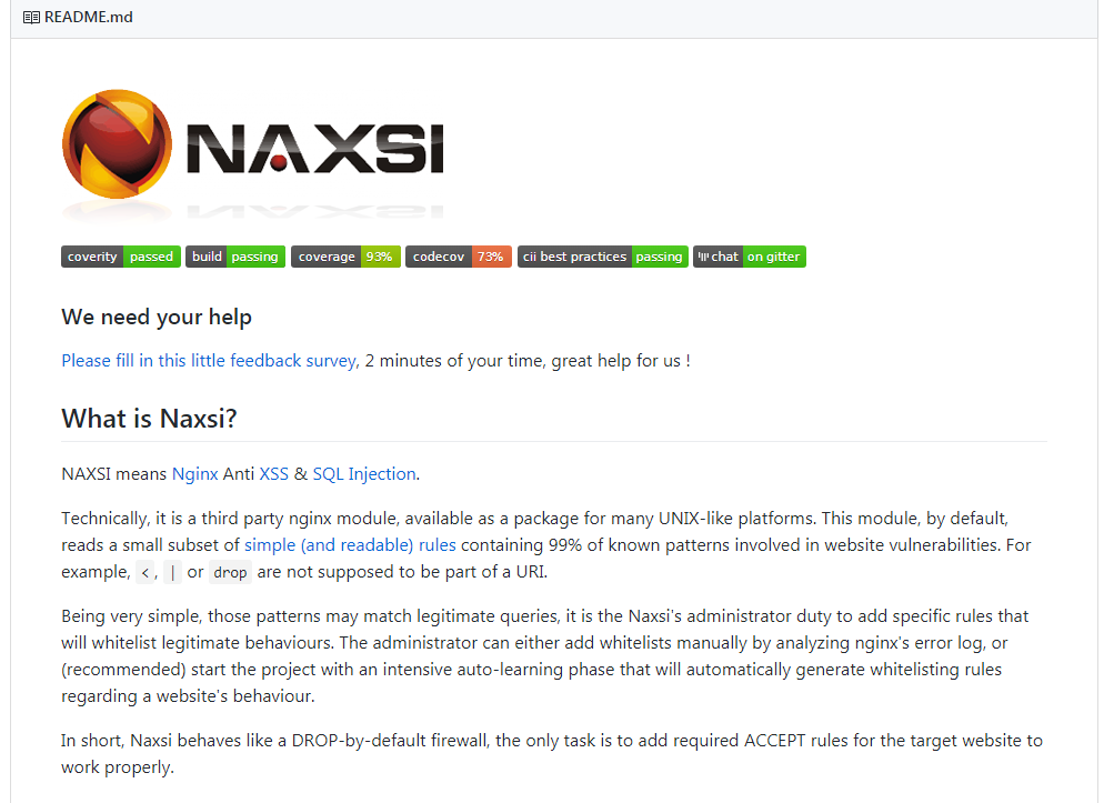 NAXSI(Nginx Anti XSS & SQL Injection)はその名のとおり、NginxにXSSやSQLインジェクション対策機能を追加するモジュールだ(図2)。NBS Systemというセキュリティ企業が開発を主導しており、こちらも安定して開発が続けられている。