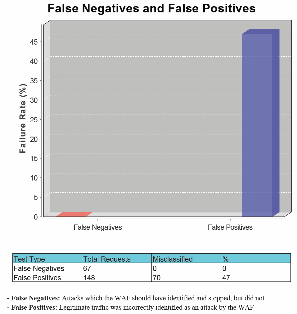 実行が完了すると、WAF Testing Frameworkと同じディレクトリ内にレポートPDFが出力される。ここでまず注目したいのが、「False Negatives and False Positives」という項目だ(図7)。