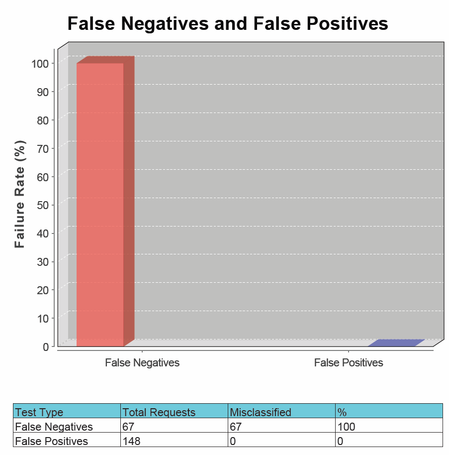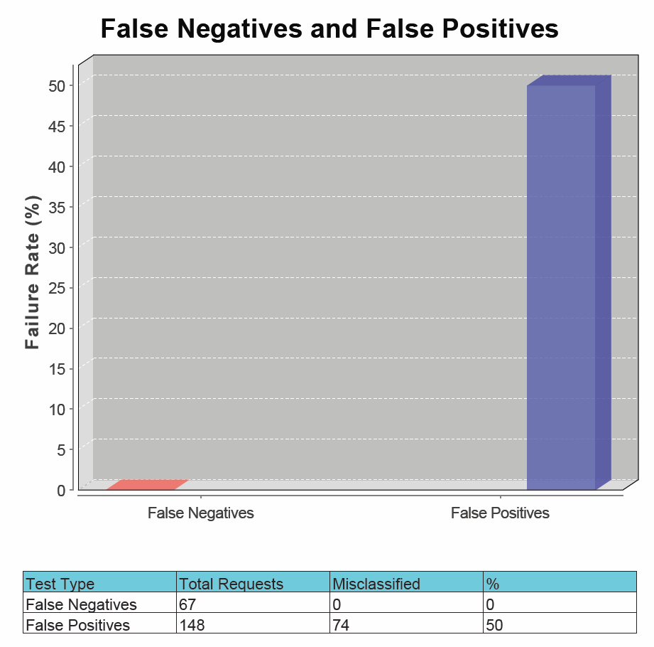 この場合、False Negativesは0%となっており、問題のあるクエストについてはそのすべてをブロックできているという結果となっている。ただし、False Positivesと判断されたリクエスト(本来は問題ないリクエストでであるにも関わらずブロックされたリクエスト)の割合は50%と高い。