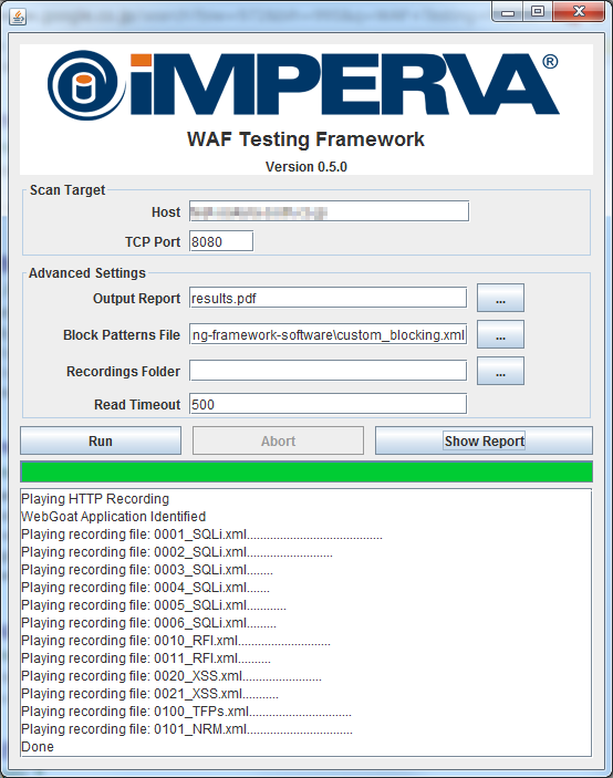 ここでは「Host」にWebGoatが稼動しているサーバー、「TCP Port」にポート番号を入力する。また、「Block Patterns File」にはWAFTesting.exeと同じディレクトリ内にある「custom_blocking.xml」を指定する。この指定を忘れるとWAF Testing Frameworkがブロックされたことを正しく検出できないので注意したい。