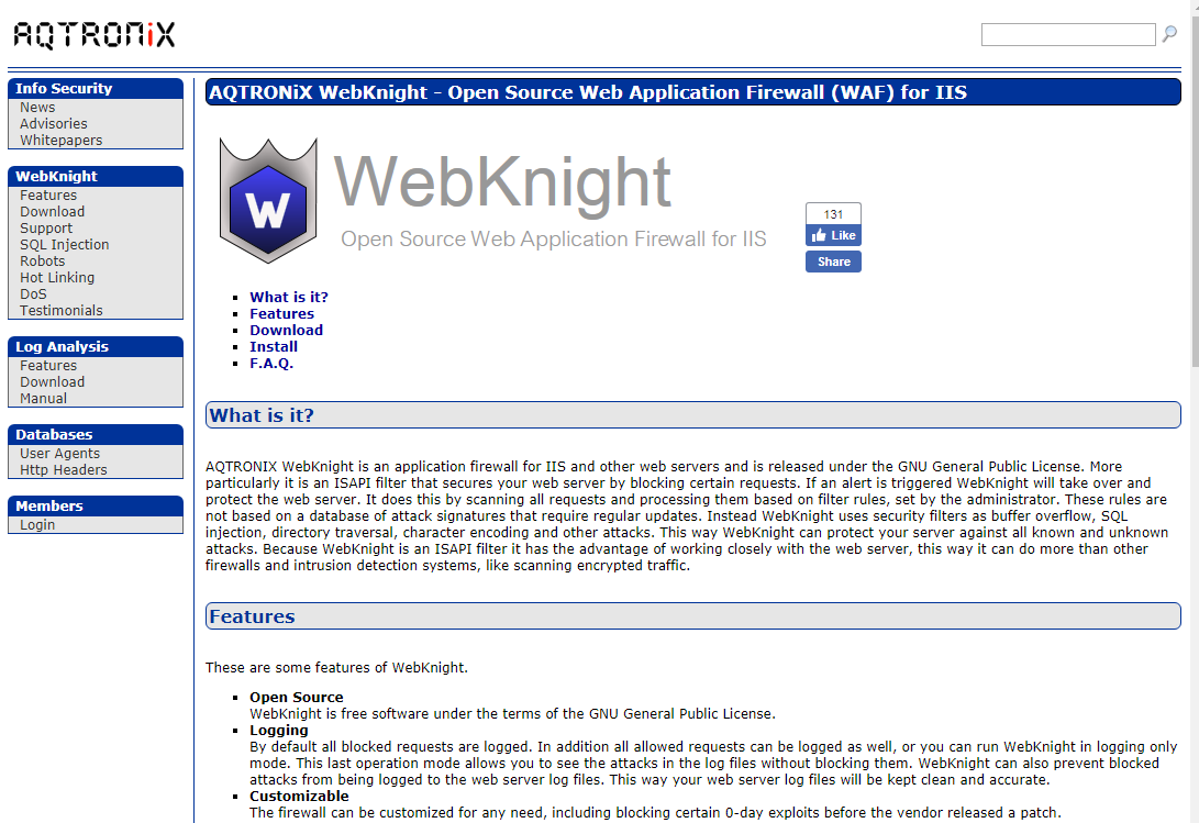WebKnightはWindowsのIIS(およびISAPI対応アプリケーション)に向けたWAFで、AQTRONIX社が開発を主導している(図3)。IIS 5からWindows 10に搭載されているIIS 10までをサポートしており、インストーラ付きで配布されているため導入がしやすい。