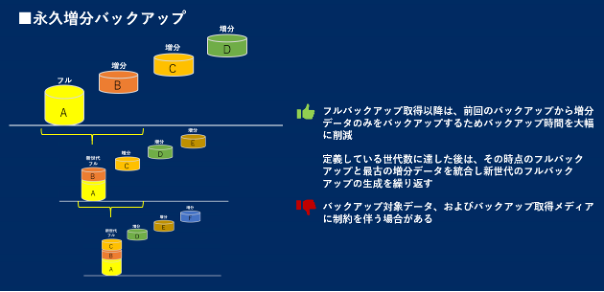 - 時間の経過に比例しバックアップデータ量が多くなるとともに時間がかかる (※極端な場合バックアップから次のバックアップまでの間にバックアップが完了しない)