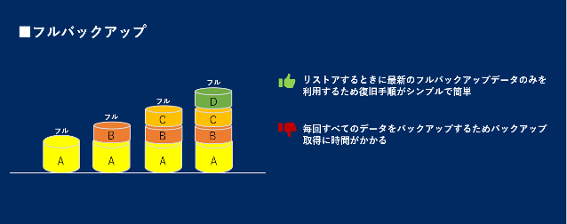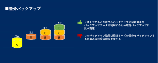 - データリカバリ時に、直近のフルバックアップデータと差分データの組み合わせでリカバリするため、差分バックアップのみでは完全なデータ復旧が出来ない
