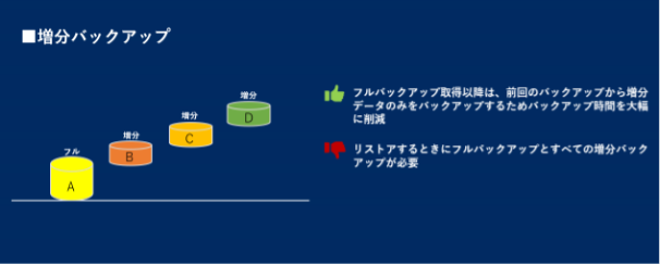 - データリカバリのために、すべての増分バックアップデータセットが必要 (※途中増分バックアップの取得が失敗している場合、それ以降のデータ復旧が出来ない)