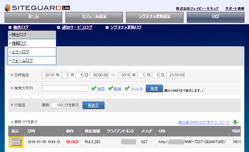 ログの表示アイコンにカーソルをあてると、ポップアップが表示され、検出した日時や動作・接続元・メソッド・URL・検出したシグネチャなどの情報を見やすいかたちで確認することができます。