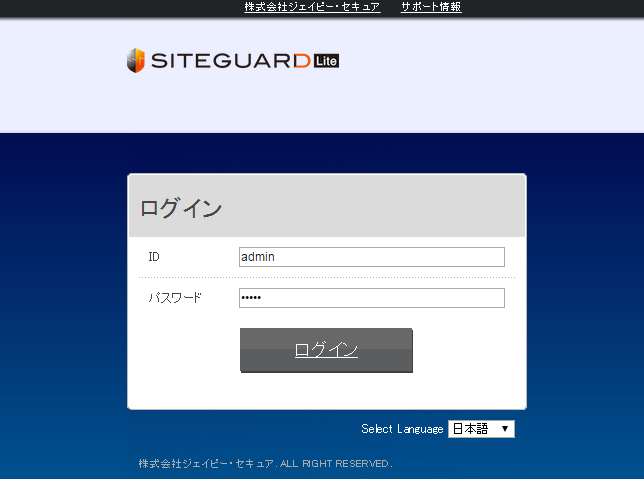 https://[サーバーホスト名(またはIPアドレス)]:9443 にアクセスすると、「SiteGuard Lite」のログイン画面が表示されます。