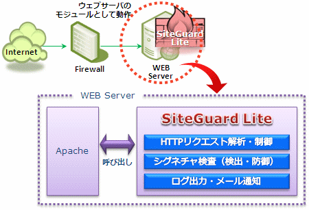 そして、「SiteGuard Lite」は、ウェブサーバーApacheのモジュールとして動作するWAFです。