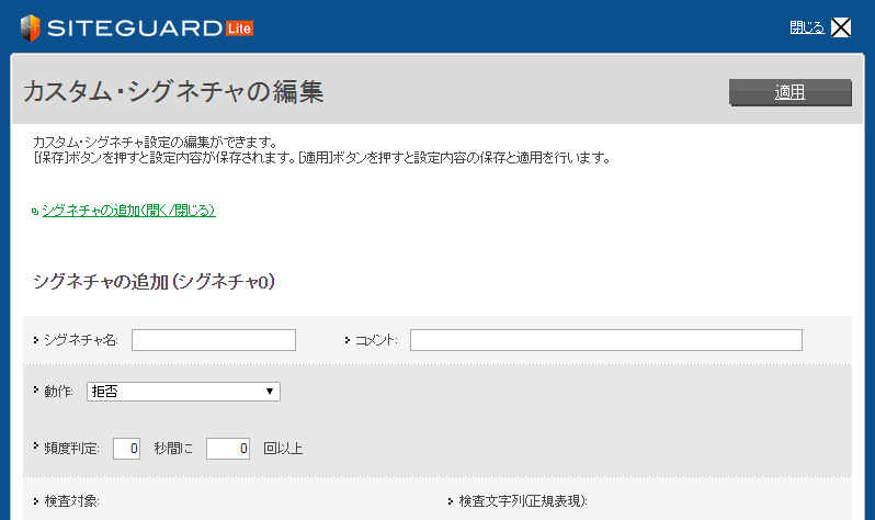 「SiteGuard Lite」では、標準搭載されているトラステッド・シグネチャのほかに、お客様独自のルールを作成できるカスタム・シグネチャによる検査が可能です。(1000個までの条件を登録することができます。)