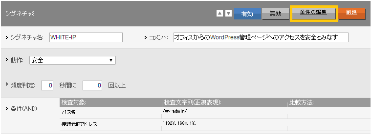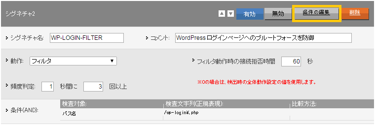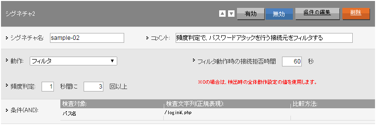 機械的な不正ログイン試行などに有効なシグネチャで、こちらも要求メソッドなどを加えた複数条件を登録することができます。