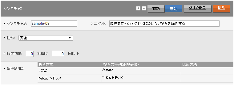 管理者アクセスの検査除外については、sample-03の最初の条件になっている検査対象"パス"の検査文字列で、