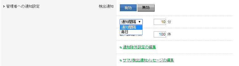 検出通知を有効にして、通知間隔を指定します。(初期値:10分)