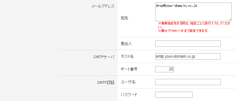 このほか、SMTPサーバのホスト名(または、IPアドレス)とポート番号、SMTP認証が必要な場合は、認証のユーザ名とパスワードを指定します。