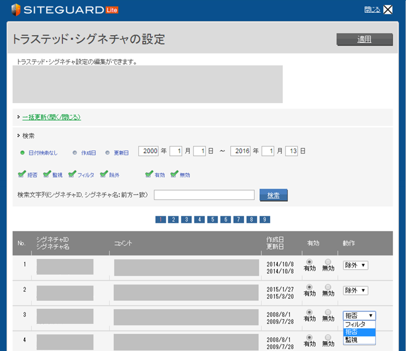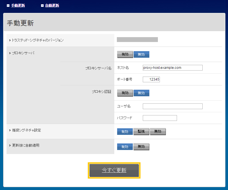 トラステッド・シグネチャの更新は、ウェブ管理画面の[シグネチャ更新設定]の画面で行います。