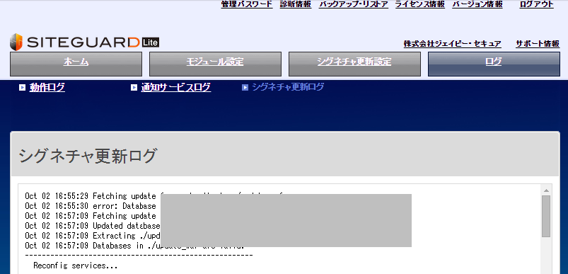 シグネチャの更新ログは、[ログ]-[シグネチャ更新ログ]で確認することができます。