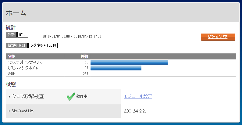 検出全体の種類別統計のほか、検出したシグネチャのTOP10を確認することができます。