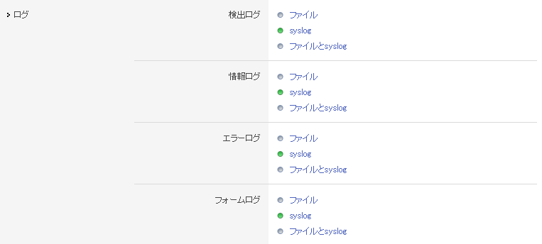 なお、syslogに出力したログファイルは、ウェブ管理画面の[ログ]-[動作ログ]には表示されませんので、ウェブ管理画面からのログ閲覧も行う場合は、ログの出力先でファイルとsyslogを選択してください。