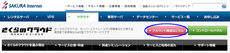 あとは、電話認証済みの会員IDを使用してさくらのクラウドコントロールパネルへのログインができます。初回はクラウド用アカウントが作成されていない状態なので、画面右上の「さくら会員としてログイン」ボタンをクリックしてログインします。