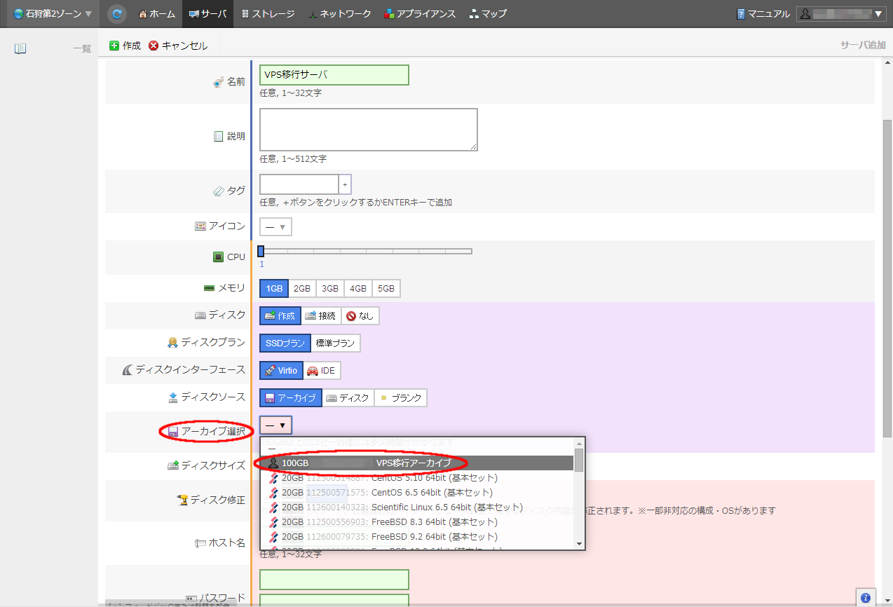 「ディスクサイズ」ではアーカイブのディスク容量より大きなサイズを指定してください。小さい場合はエラーとなり、サーバを作成することはできません(より大きなディスクを指定した場合、そのままではさくらのVPS側のディスク容量分までしか使用できません。必要に応じてファイルシステムのサイズ変更作業を実施してください)。
