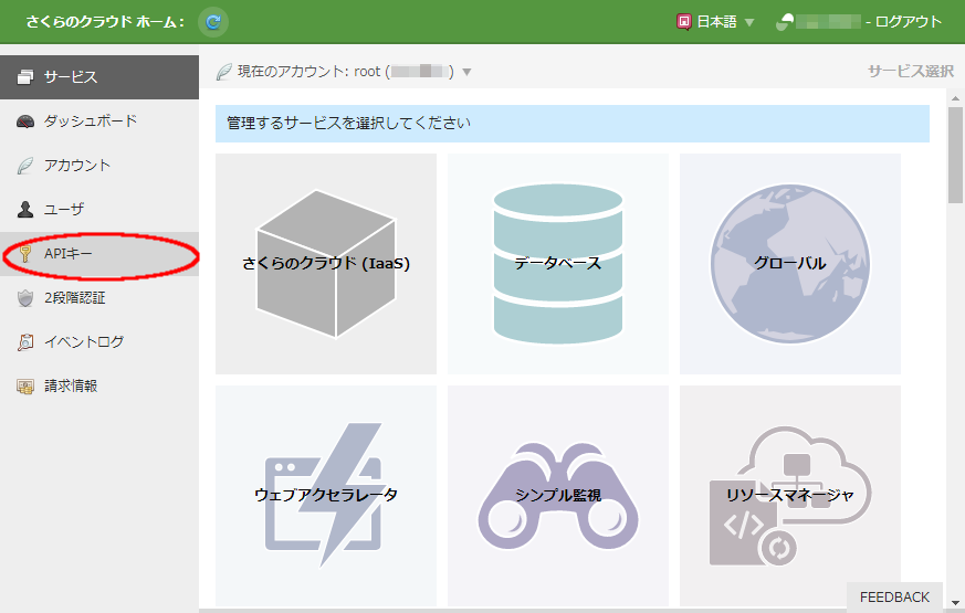 APIキーの作成や編集は、さくらインターネット会員IDもしくはAPIキーの作成権限を持ったユーザでコントロールパネルにログインする必要があります。 ログイン後、左側のメニューより「APIキー」を選択します。