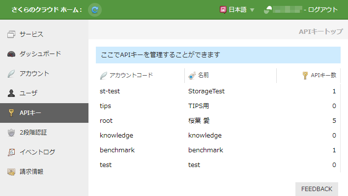 APIキーはアカウントごとに作成されまます。リストに現在ログイン中のユーザがAPIキー操作権限を持つアカウント一覧が表示されるので、APIキーの新規作成や既存のAPIキーの編集を行いたいアカウントをクリックします。