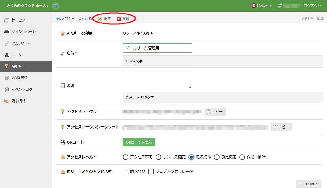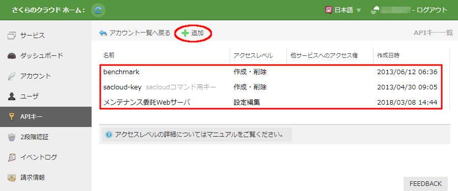 | 他サービスへのアクセス権 | さくらのクラウド(IaaS)以外のサービスへのアクセス権が必要な場合チェックします ※詳しくは アクセスレベル を参照ください |