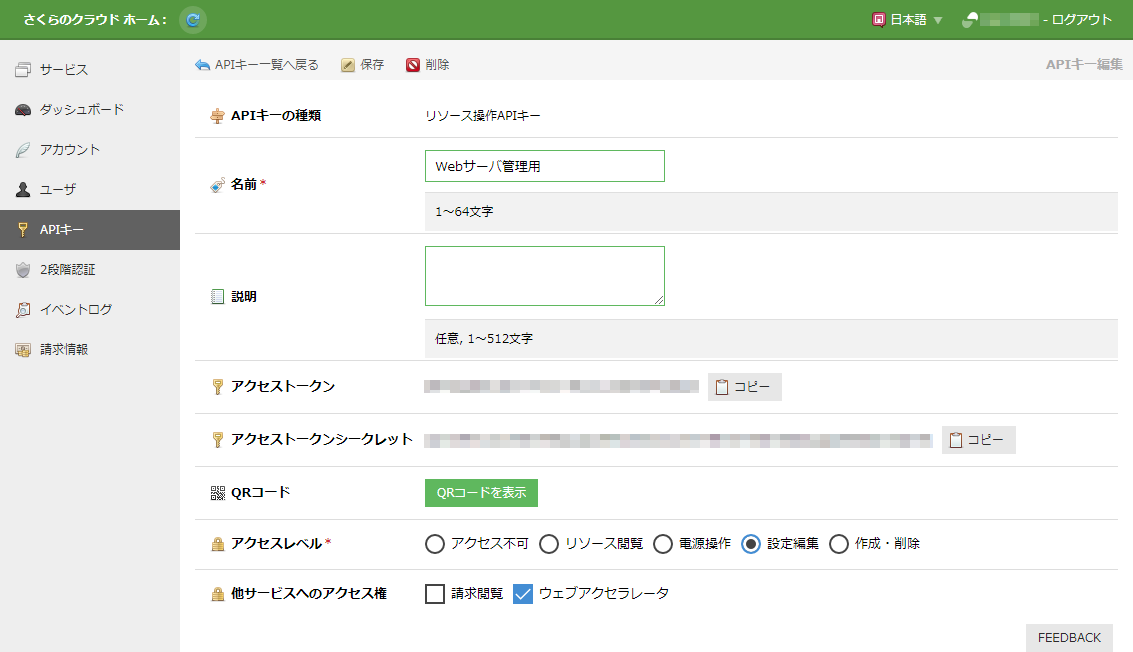 画面はAPIキーの種類が「リソース操作APIキー」の場合です。「シングルサーバAPIキー」の場合はアクセスレベルの選択内容や紐づけ先サーバの設定があるなど一部異なります。詳しくは シングルサーバコントロールパネル を参照ください。