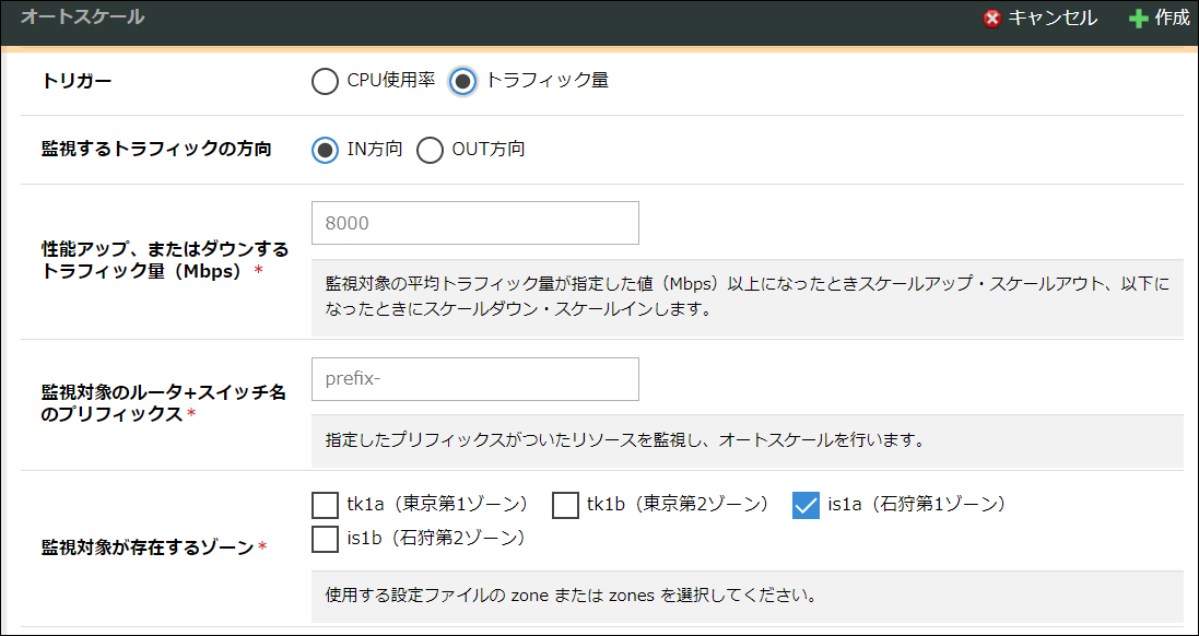 | 監視対象が存在するゾーン | オートスケールの監視対象のサーバが存在するゾーンを選択します。 |