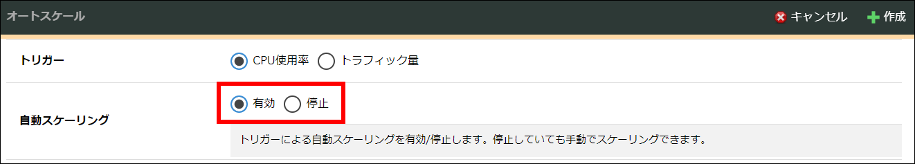 自動スケーリングを一時的に停止したい場合や、APIのみ利用してオートスケールを実行したい場合には「停止」を選択します。