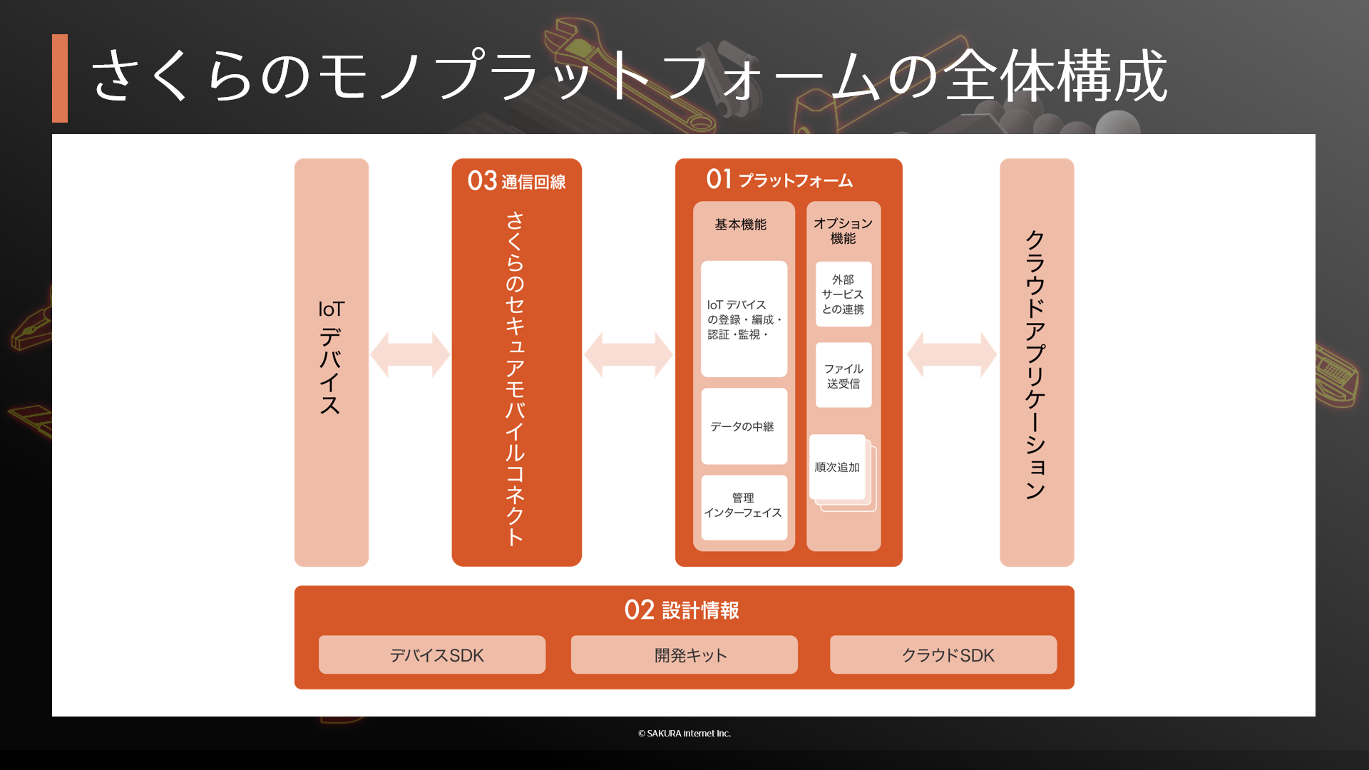 さくらのモノプラットフォームは「IoTシステムの構築を楽にするプラットフォーム」「IoTデバイス開発のための設計情報」「マルチキャリア対応通信回線」を一貫して提供するIoTプラットフォームサービスです。