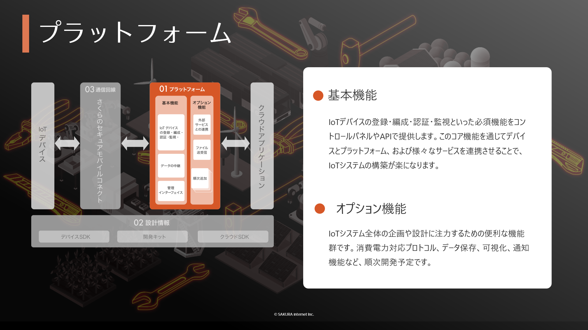さくらのモノプラットフォームは大きく分けて「プラットフォーム」「設計情報」「通信回線」の3つの要素に分けることができます。 これらの要素を一つのサービスとしてご提供することで、IoTシステムにおける構築の手間を削減し、サービス化を支援できるようにします。