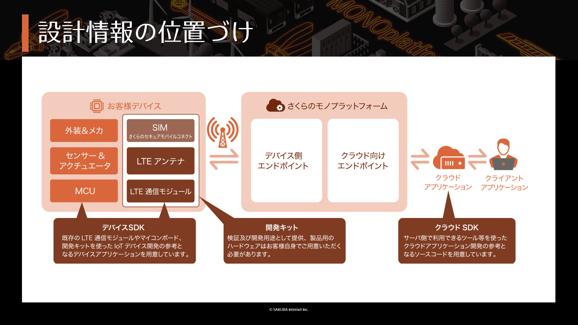 設計情報には検証用に利用可能なIoTデバイスの電気設計に役立つ 「開発キット」 、IoTデバイスの組み込みソフトウェア設計に役立つ 「デバイスSDK」 、