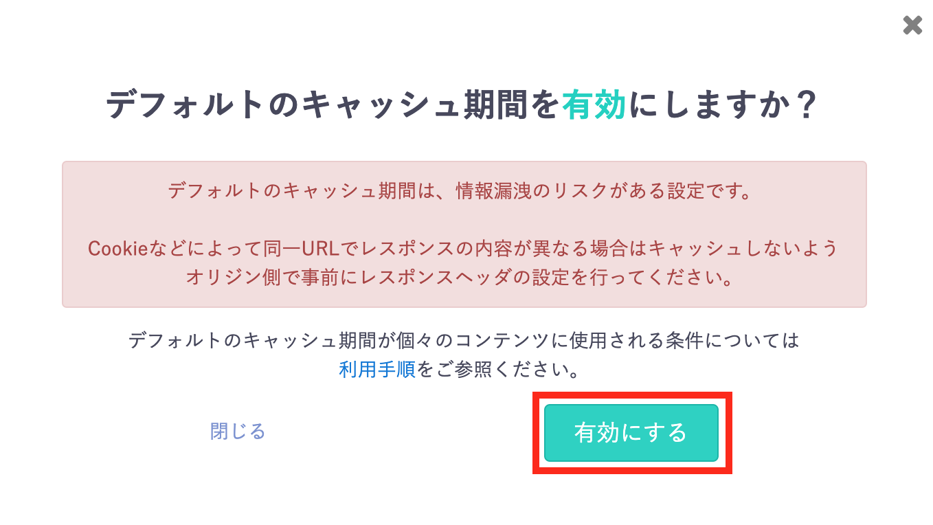 3. デフォルトのキャッシュ期間を有効にしますか?の画面が開きますので、問題なければ「有効にする」ボタンをクリックします。