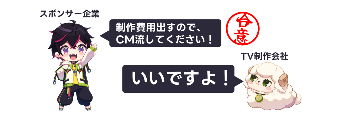 テレビCM はお金が動く形の契約ですが、両者が合意すればどんな形でもスポンサー契約は結べます。