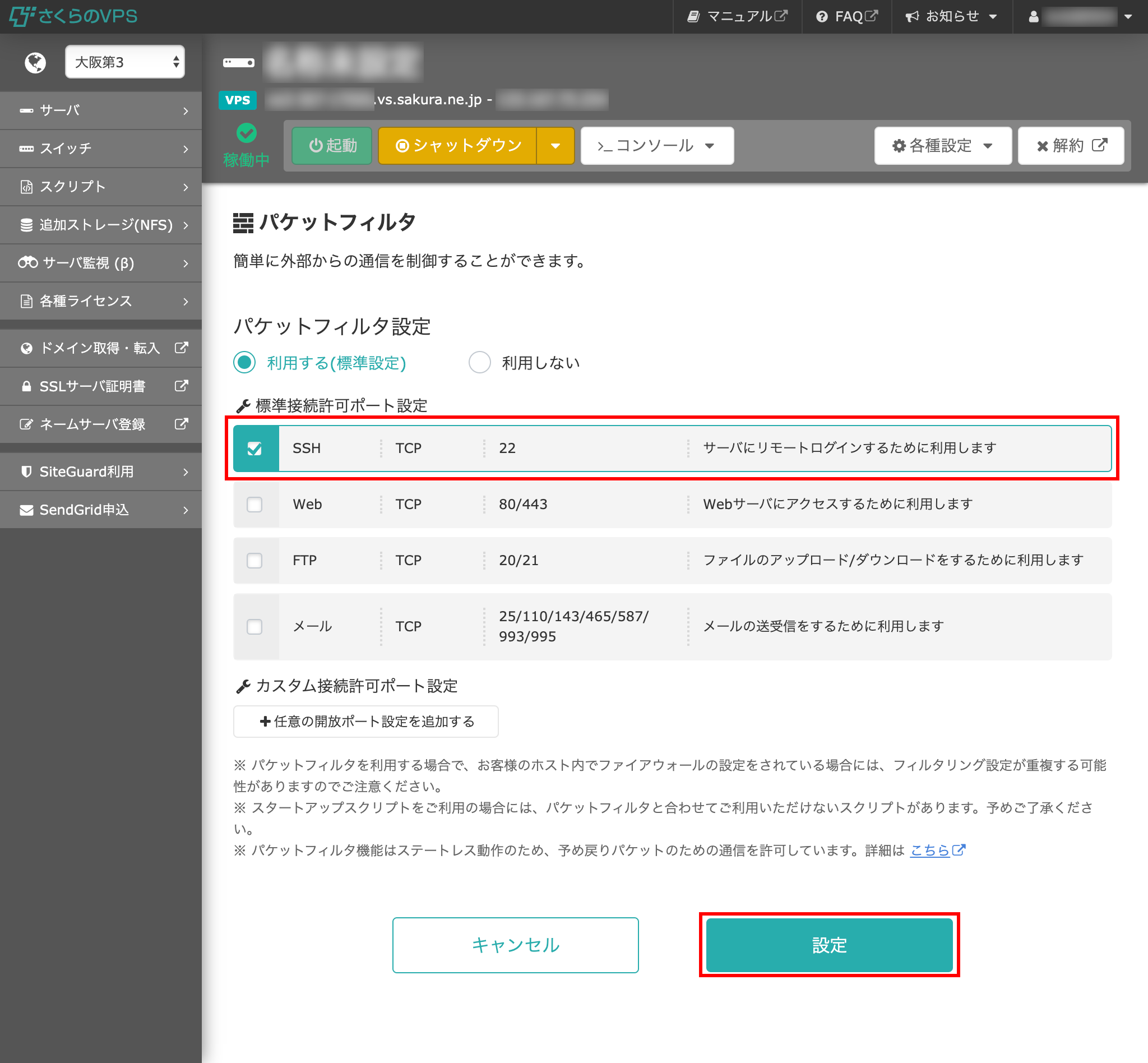 ご契約中の「さくらのVPS」でパケットフィルタ機能を有効化する場合の設定方法です。