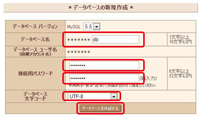 3「データベース名」「接続用パスワード」を入力後、「UTF-8」を選択し、「データベースを作成する」をクリックします。