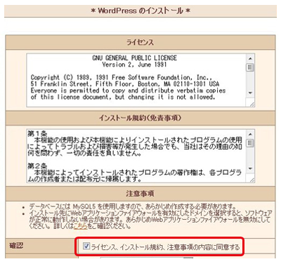 4「ライセンス」「インストール規約(免責事項)」「注意事項」を確認し、「確認」をチェックします。