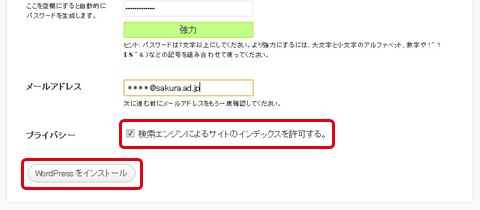 09「プライバシー」をチェックし、「WordPressをインストール」をクリックします。