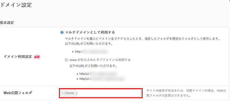 6「ドメイン利用設定」の『Web公開フォルダ』にSTEP1にて作成したフォルダ名を入力します。