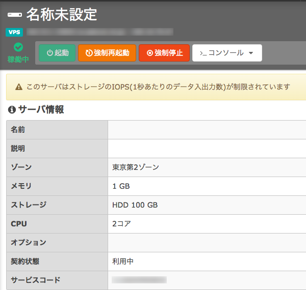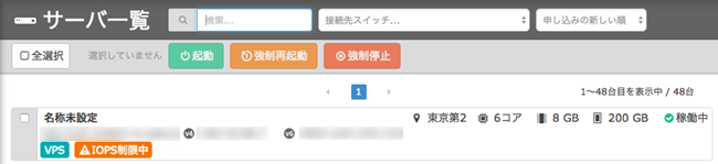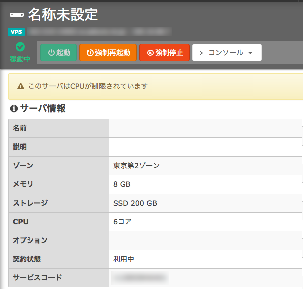 リソース制限中は、コントロールパネルの『 サーバ一覧 』または、各サーバの詳細画面に以下の表示がされます。
