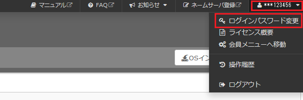 画面右上に表示されている会員IDをクリックし、『ログインパスワード変更』を選択します。
