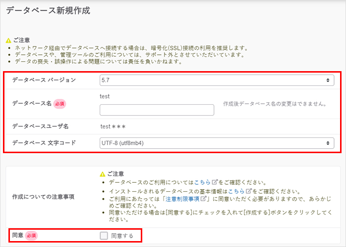 3作成するデータベースの情報を入力後、『作成する』をクリックします。