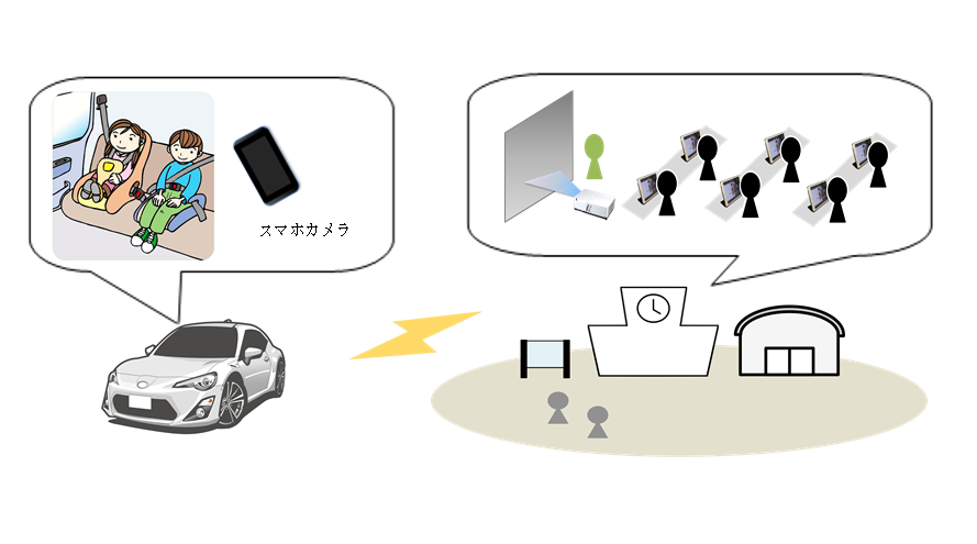 車内の映像をリアルタイムで配信し、評価担当の方達が教室で視聴していれば、指導をしながら、的確に評価を行うことが可能になります。そのような背景があり、必要な設備が少なく(配信用カメラ付きスマートフォン、マイクロサーバ、受信用端末)、導入に手間のかからない本システムのデモ依頼が来た次第です。