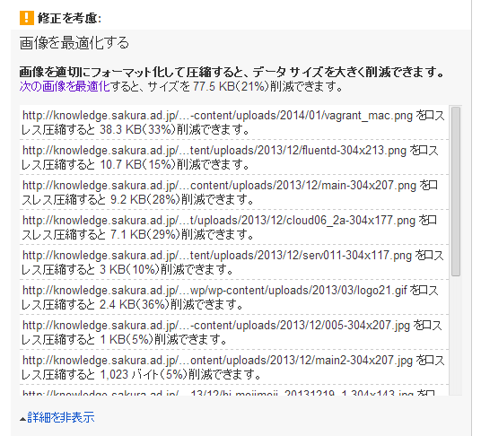 「画像を最適化する」で示される項目は主にPNGファイルの最適化である。PNGファイルは最小ファイルサイズで保存されているとは限らず、一般的な画像編集ツールだと大き目のファイルサイズになっている。これをoptipngなど最適化ツールで再圧縮すればかなりのファイルサイズを減らすことが可能だ。また、GIFファイルはPNGに置き換えることでファイルサイズが小さくなることが多い。