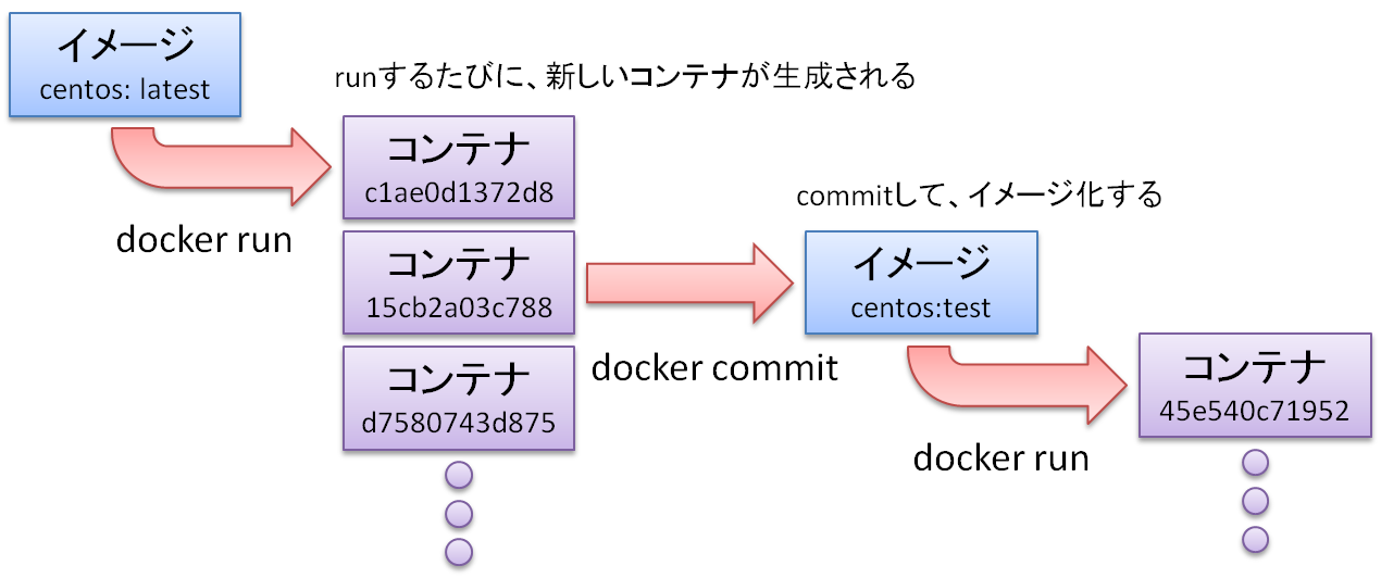 なお、Dockerで作成されたコンテナの中にファイルを書き込んだとしても、再度実行したときには無くなっていることを意味しており、実行したあとのコンテナを再度利用するには、後述するコミットを実行しなければなりません。
