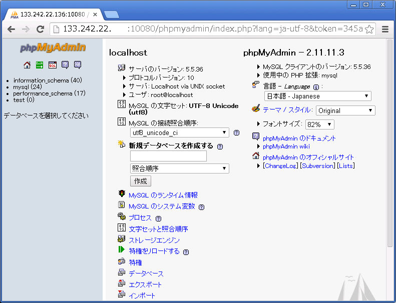 URLは、dockerの動いているサーバの10080番ポートですので、192.168.1.1というサーバで動いてたとすると、http://192.168.1.1:10080/phpmyadmin/ と入力するとアクセス可能です。