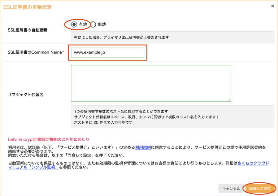 「Let’s Encrypt」は弊社社外で提供されるサービスのため、さくらのクラウドで保証するサービス継続性や完全性の対象外となります。ダイアログボックス内に表示される情報を十分ご確認の上ご利用ください。「同意して設定」ボタンをクリックすることで諸条件に同意したものと見做されます。