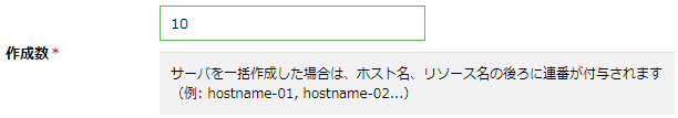 負荷分散用のクラスタや一時的に使用するVDI用など、同一のスペック・同一ディスク内容のサーバを大量に作成したい場合は サーバ新規作成 フォームでサーバ作成数の項目を複数指定することで、一度の操作で同時に作成することが可能です。